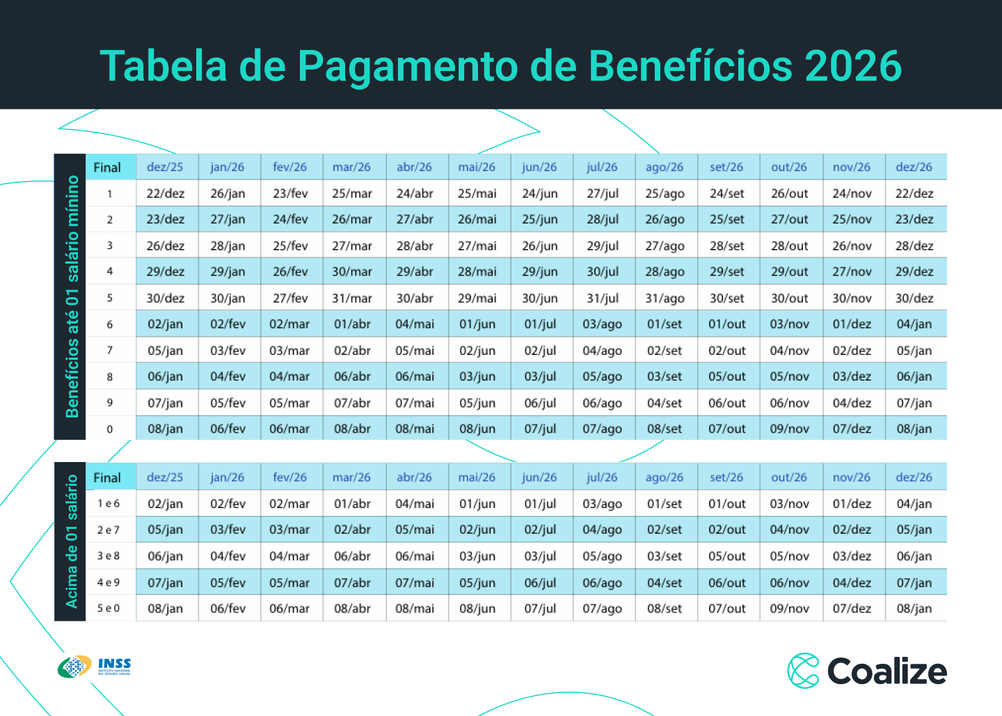 Divulgado anualmente pelo INSS, normalmente no final do ano anterior, o calendário de pagamento segue o número final do benefício (NB), sem considerar o dígito verificador, e separa os depósitos entre quem recebe até um salário mínimo e quem recebe acima do piso nacional